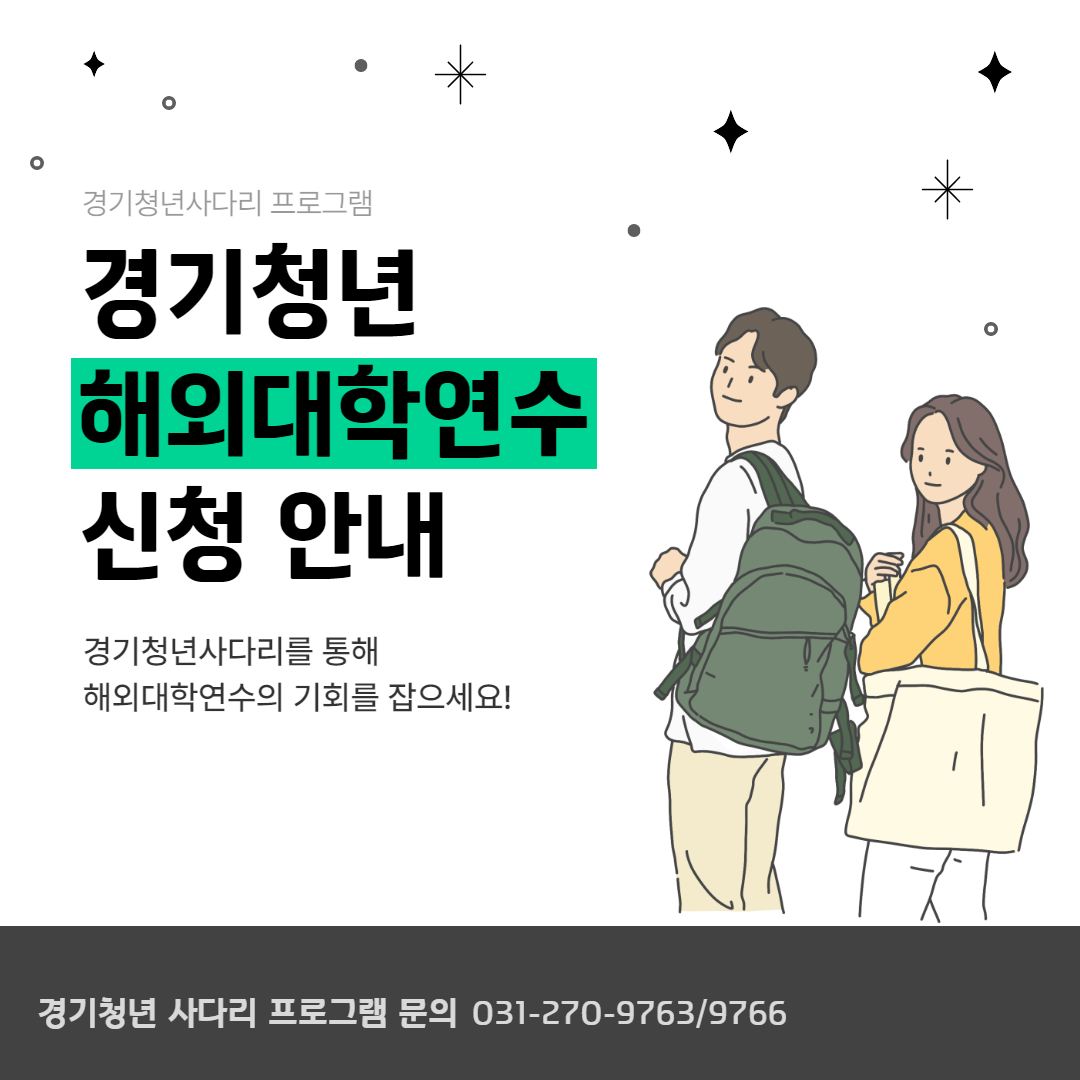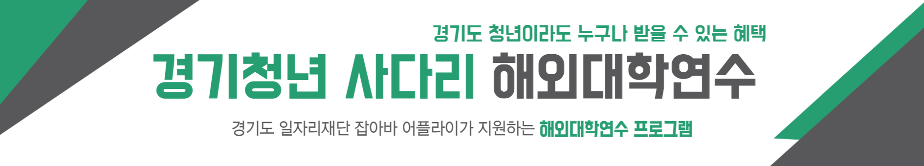 주변에 친구들이 워킹홀리데이나 어학연수를 많이 떠나시는 것을 보시고 나에게도 이런 기회가 있었으면 좋겠다고 생각했던 분들이 혹시 계신가요? 이번에 경기도 일자리재단에서 경기도에 살고 있는 만 19세~34세 청년들 150명을 대상으로 해외대학연수 프로그램의 기회가 제공한다고 합니다. 경기청년이라면 누구나 해외대학연수의 기회를 잡을 수 있다고 하니 아래의 링크를 남겨두겠습니다. 일반적으로 입학하기도 어렵고 가기도 어려운 해외 4곳의 대학교를 이런 기회로 갈 수 있다고 하니 솔직히 엄청난 기회라고 생각됩니다. 관심 있으신 분들은 놓치지 마시고 글에 집중해 주세요!