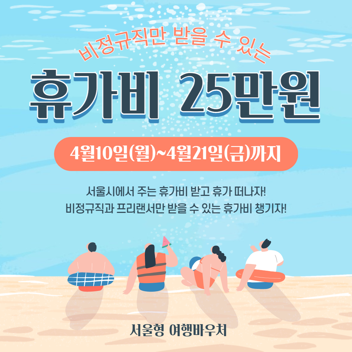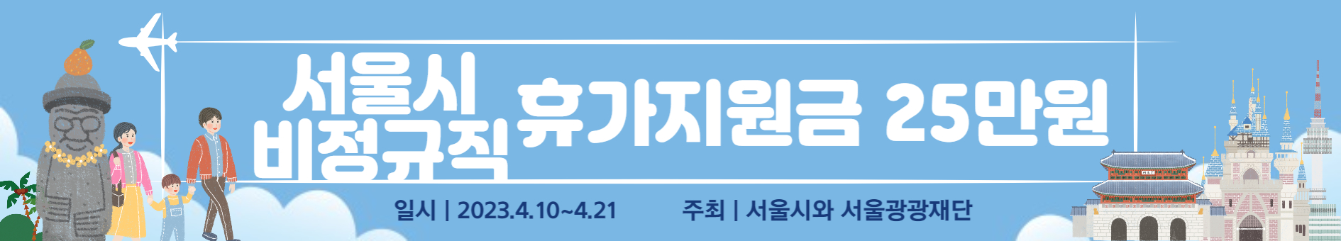 서울시와 서울관광재단이 비정규직 및 특수형태근로종사자에게 25만 원의 휴가비를 지원한다고 합니다. 서울형 여행바우처는 서울시에 거주하고 있는 19세 이상의 비정규직 및 프리랜서와 같은 근로종사자에게 4월 10일부터 신청을 받는다고 합니다. 서울시와 서울관광재단에서 하는 만큼 선착순 3200명을 기준으로 하고 있으니 접수기간에 빨리 신청하셔야 합니다. 1분만 투자하시면 서울시에서 주는 공짜돈으로 이번 2023년도 휴가를 즐기실 수 있습니다. 혹시 빨리 접수하고 싶으신 분들을 위해 아래에 접수 신청할 수 있는 링크를 남겨두겠습니다.