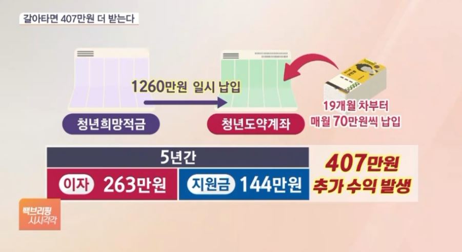 갈아타게 되면 매달 70만 원씩 5년 납부하는 금액보다 약 53만 원의 추가 수익이 발생합니다. 시간이 줄어드는 것은 아니지만 청년희망적금을 한 시간이 인정되는 거니깐 돈 적인 부담과 기한에 대한 부담감은 다소 줄어들 수 있습니다.