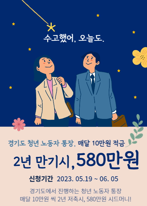 서울시 희망두배통장이나 부산시 기쁨두배통장 같이 경기도에도 청년을 위한 청년 노동자 통장 사업 참여자를 모집한다고 합니다. 매달 10만 원씩 저축을 하면 2년간 총 580만 원을 받을 수 있는 통장입니다. 경기도에서 지원금으로 만기 시 580만 원이라는 돈은 청년들이 받을 수 있도록 하는 사업이며, 마감기간이 정해져 있기 때문에 어서 빨리 신청하시기를 바랍니다. 신청할 수 있는 조건이 되시면 무조건 신청하세요! 일반 은행에서 받는 이자율보다 훨씬 좋으니 놓치시면 후회하실 겁니다.