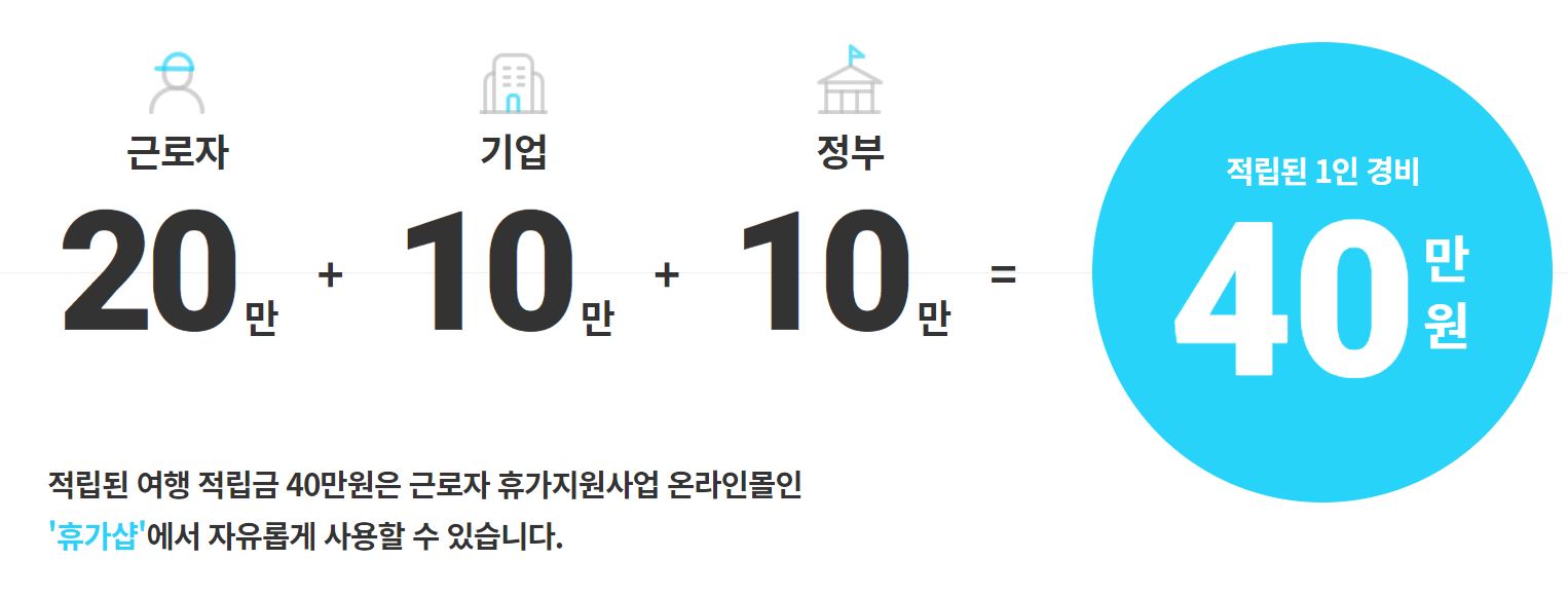 기업과 근로자 공동으로 여행자금을 적립하여 정부가 추가로 10만 원을 지원하는 정책이며 근로자 20만 원, 기업 10만 원, 정부 10만 원으로 총 근로자 한 사람당 적립된 40만 원의 경비로 국내 여행을 즐길 수 있습니다. 근로자는 지급받은 포인트로 전용 온라인몰에서 숙박, 입장권, 패키지와 같은 여행상품을 구매하여 사용할 수 있습니다.
